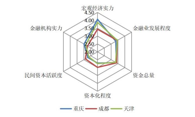 在重庆和天津中间,还隔着金融实力排名第7的成都。三地的金融实力非常接近,总得分相差仅在0.02分之内。与重庆、天津相比,天府之国的成都在金融业发展程度、资金总量、资本化程度和民间资本活跃度上均占优(图6)。