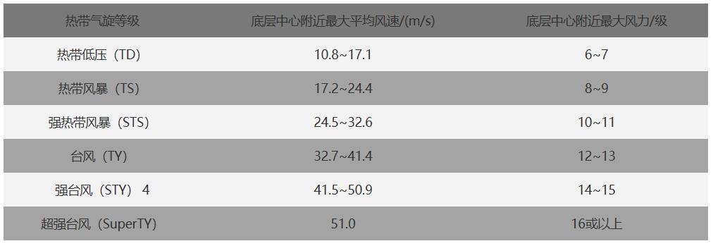 热带气旋分为热带低压、热带风暴、强热带风暴、台风、强台风和超强台风六个等级。