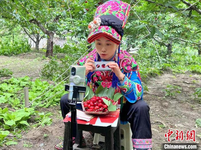 中新网汶川6月7日电 (邵理燕)眼下,正是四川汶川甜樱桃销售旺季,如何在疫情防控的特殊时期更好地将甜樱桃在网上销售。汶川的年轻人拿着手机走进了樱桃园,在树下进行着一场场直播,羌族青年“汶川燕子”便是其中之一。