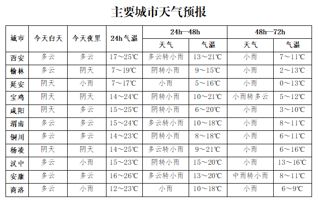19日:全省阴天,陕北、关中有小雨(0.1~5毫米),局地中雨(10~15毫米),秦岭山区、陕南有小到中雨(2~20毫米),其中汉中西部局地有大雨(25~30毫米)。日平均气温全省大部下降6~8℃,关中东部、陕南东部可达8~10℃、局地10℃以上。陕北有4~5级偏南风,关中大部、陕南部分地方有4~5级偏东风,阵风可达7级以上。