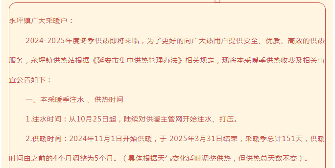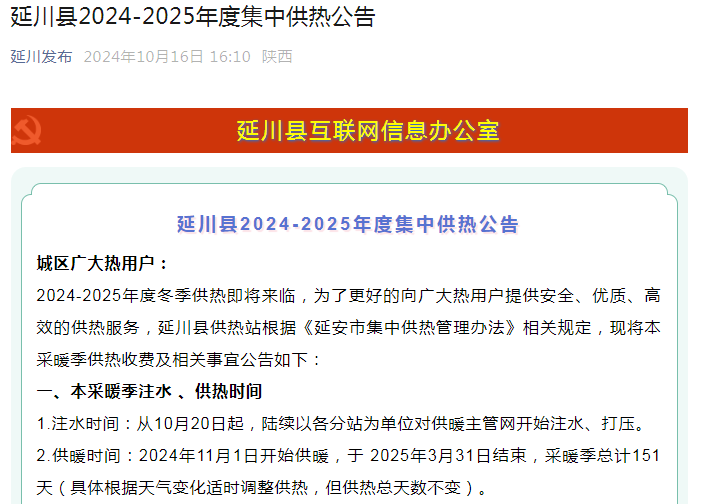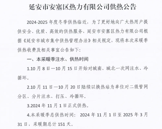 延安多地发布供暖时间通知,从2024年11月1日开始供暖,于2025年3月31日结束,采暖季总计151天,供暖时间由之前的4个月调整为5个月。(具体根据天气变化适时调整供热,但供热总天数不变)。