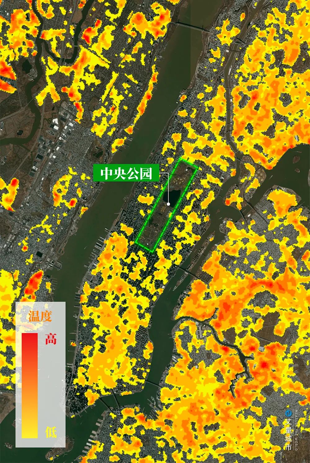 ▼ 纽约中央公园对「城市热岛效应」的局部调节作用示意