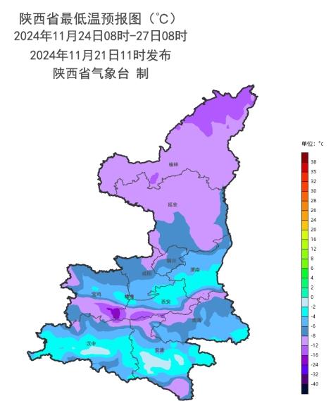 24-25日过程日平均气温全省大部下降8~10℃,局地下降12℃以上。预计最低气温出现在27日清晨:陕北、秦巴山区-15~-7℃,关中西部及北部-9~-7℃,商洛-8~-6℃,关中南部、汉江河谷-6~-3℃。