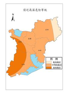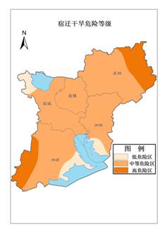 高温致灾因子危险性主要考虑高温日数和极端最高气温。将两个影响因子分别通过权重系数为0.5和0.5计算得到高温致灾危险性等级。如图5所示,泗洪、宿城西部地区为高温高危险区,沭阳东部为低危险区,其它地区均为中等危险区。
