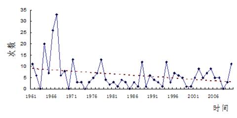 从图1中分析,1961-2010年宿迁市区高温日的逐年分布图中可以看出,50年间高温日数呈现明显的年际特征。高温日数出现的次数整体呈下降趋势,高温日数最多的年份是1968年为33天,而1963年、1970年、1974年、1985年以及2008年全年均没有出现高温,其年际变化最大可达33天。并且高温日数较多年份的次年,高温日数将会明显减少。