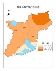 低温冻害致灾因子危险性主要考虑低温日数、极端最低气温和结冰日数。将以上三个影响因子权重系数分别设为0.3、0.4和0.3,经计算得到低温冻害危险性等级。如图7所示,沭阳东北部地区低温冰冻的危险等级高,泗阳和泗洪东南部为低危险区,其它地区危险等级中等。