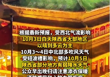 10月3日陕西大部地区以晴到多云为主,十一后期西安市有降雨天气,早出晚归注意添衣