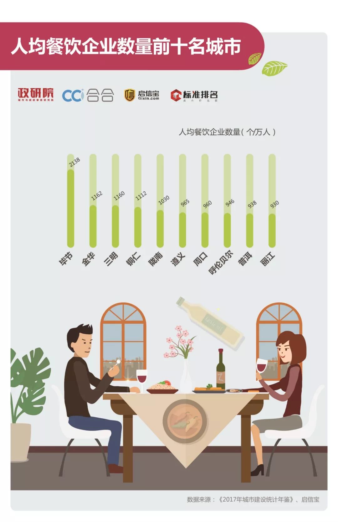 其它4个分别为浙江金华(1162个/万人)、福建三明(1160个/万人)、贵州铜仁(1112个/万人)、甘肃陇南(1030个/万人)。人均餐饮企业数量最少的是新疆昆玉,为12个/万人,而令人意外的是,北京与上海分别以37个/万人和41个/万人位列人均数量倒数第四、第五名。