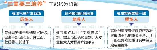 长庆油田始终坚持事业发展需要与干部成长进步相统一,把最合适的干部放到事业发展最需要的地方。公司重点构建“三需要三培养”干部锻造机制,即把基层一线作为培养干部的主战场,把急难险重任务作为锻炼干部的“磨刀石”,将实践锻炼作为选用干部的“试金石”。公司积极推进干部配置性交流、培养性交流、制度性交流,有计划安排干部到一线历练,促进干部经风雨、见世面,壮筋骨、长才干。同时,加大机关与基层纵向交流以及跨单位横向交流力度,实行关键岗位定期轮岗或分工调整制度,持续发挥好重点工程、重大项目、重要改革平台的作用,推动领导干部在不同岗位、不同环境历练成长。