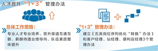 河北销售公司探索建立客户经理、站经理、便利店经理3个管理办法,为各序列员工纵向发展铺设了跑道,制定《五类岗位序列优化“转换”办法》,建立起经营管理岗位、专业技术岗位、市场营销岗位、经理人岗位、操作技能等级序列横向顺畅的转换机制,明确了五类岗位序列间相关层级的“转换”对应关系,畅通了优秀站经理、客户经理、便利店经理以及专业技术人才到管理岗位序列、营销专家岗位序列发展的渠道。办法出台以来,公司已有25名站经理、客户经理步入管理岗位序列,4名一线人员晋升为基层领导人员。