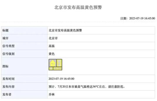 【继续发布高温黄色预警信号】市气象台2023年7月19日16时45分继续发布高温黄色预警信号:预计,7月20日本市最高气温将达36℃左右,请注意防范。