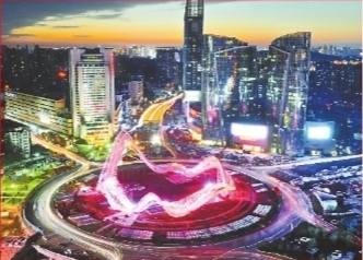 光谷广场综合体中心环岛大型钢结构公共艺术品“星河”彩灯亮起,光彩夺目