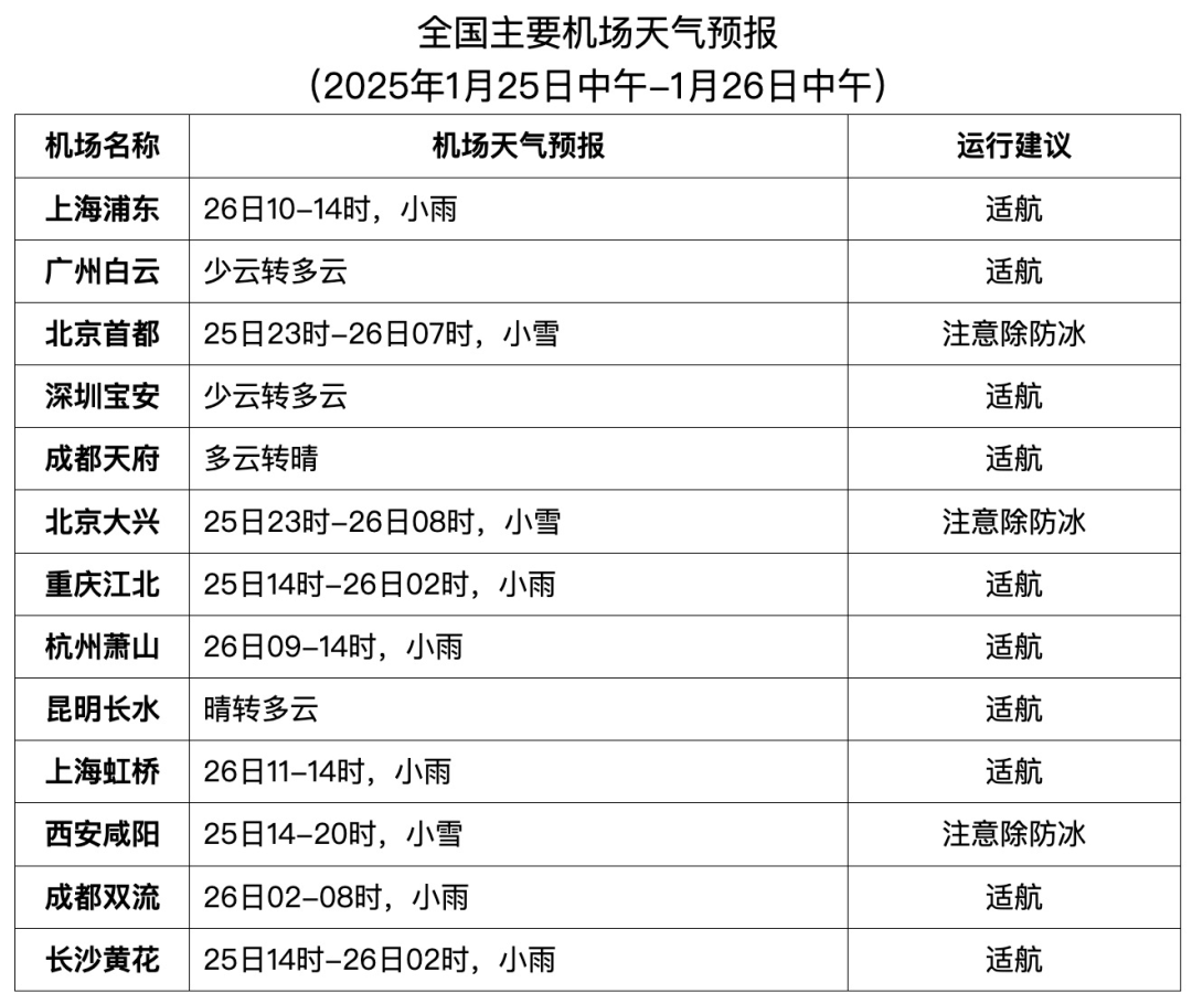 25日中午至26日中午,西安、太原、呼和浩特、郑州、石家庄、北京两场、天津、济南等机场自西向东有一次小雪过程;25日夜间至26日早间,乌鲁木齐机场有300-500米冻雾。