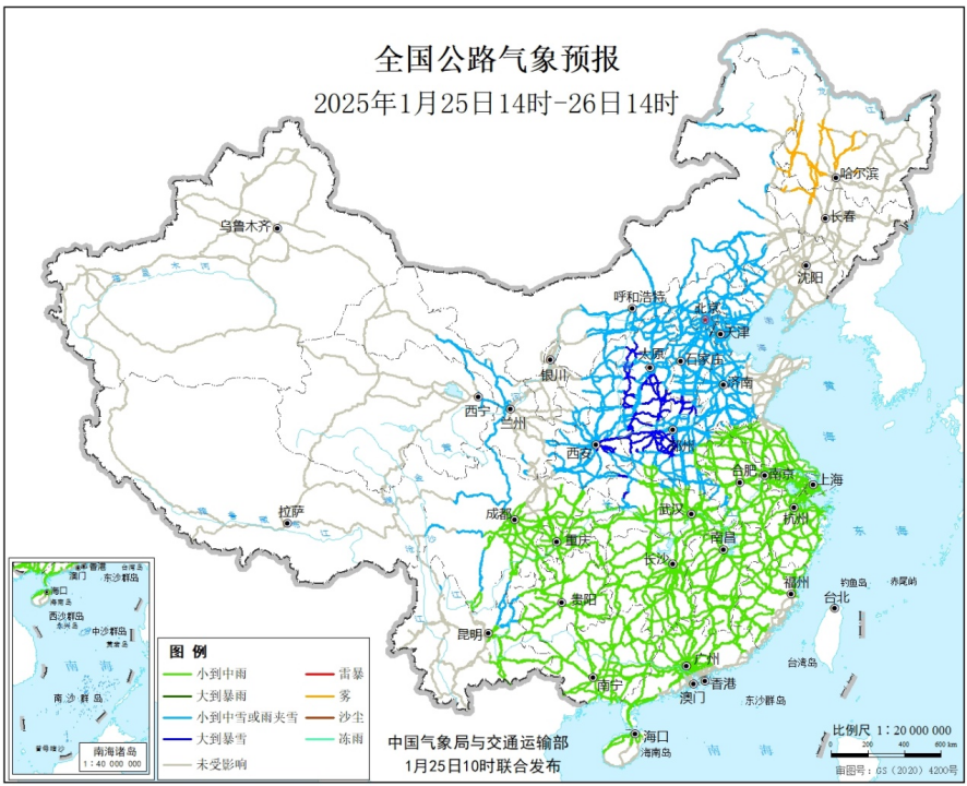 五、全国公路交通影响预报预计25日14时至26日14时,北京、天津、河北、河南、山东中西部、山西、内蒙古中东部、陕西、甘肃西部和东部、湖北西北部、安徽西部、四川西部、云南北部、青海东部等地部分道路受降雪或雨夹雪影响,发生道路湿滑、结冰、积雪的风险较高;江淮、江汉、江南、华南、西南地区东部等地部分道路受降雨影响,发生道路湿滑的风险较高;黑龙江西南部、吉林西北部等地局地道路需防范低能见度对交通出行的影响(见图4)。