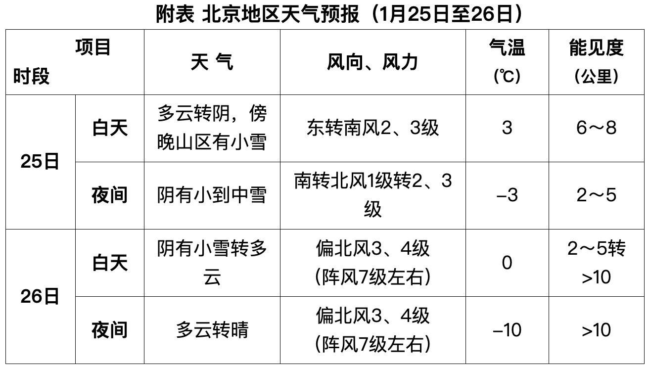 三、北京地区天气预报预计25日白天,北京地区天气转阴,傍晚山区有小雪,夜间有小到中雪;26日白天降雪逐渐结束,夜间天气转晴;降雪期间能见度较差,夜间有轻雾。另外,受强冷空气影响,26日白天至夜间有3、4级偏北风,阵风7级左右;气温大幅下降,白天最高气温3~0℃,夜间最低气温-3~-10℃。