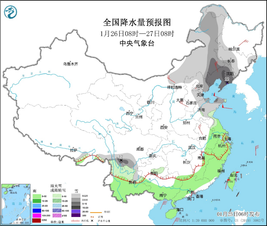 图2 全国降水量预报图(1月25日14时至26日08时)