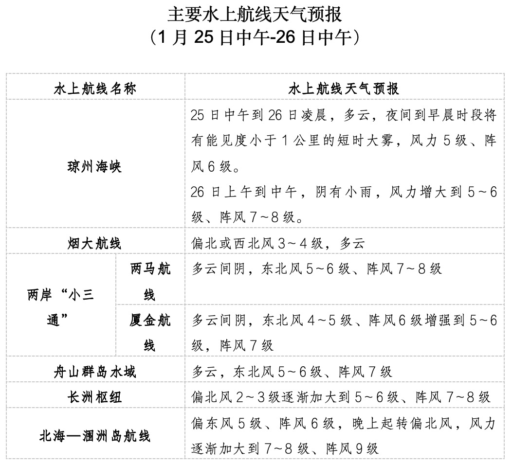 预计25日中午到26日凌晨,琼州海峡,多云,夜间到凌晨时段部分海域将有能见度小于1km的短时大雾,风力5级、阵风6级,有雾时琼州海峡航段能见度差,对通航有一定影响,其余时段通航气象条件良好。26日上午到中午,琼州海峡,阴天有小雨,风力增大到5-6级、阵风7-8级,通航气象条件一般。