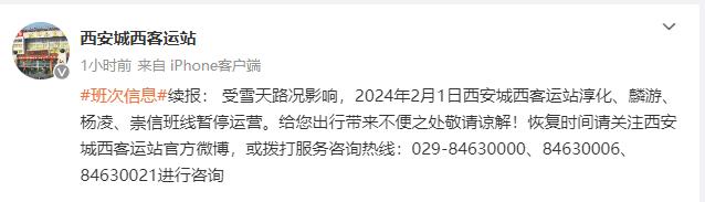 2月1日,据西安城西客运站消息,受雪天路况影响,2024年2月1日西安城西客运站淳化、麟游、杨凌、崇信班线暂停运营。