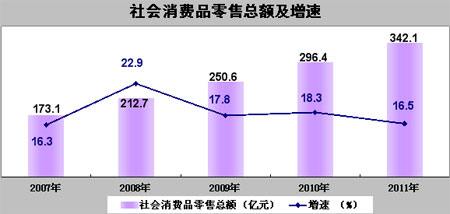 全年实现社会消费品零售总额342.1亿元,同比增长16.5%。其中,限额以上企业(单位)实现消费品零售额102.1亿元,增长28.5%。按经营单位所在地分,城镇消费品零售额258.2亿元,比上年增长18.4%;乡村消费品零售额83.9亿元,增长11.2%。按消费形态分,餐饮收入43亿元,增长17.1%;商品零售299.1亿元,增长16.4%。在商品零售中,限额以上企业(单位)商品零售额89.4亿元,增长29.2%。