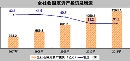 全年全社会固定资产投资完成1263.1亿元,比上年增长31.3%,扣除价格因素实际增长24%。其中,固定资产投资(不含农户)1125.2亿元,增长31.2%。