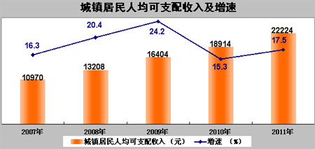 全年城镇居民人均可支配收入22224元,比上年名义增长17.5%,扣除价格因素,实际增长11.5%。在城镇居民人均总收入中,工资性收入18787元,比上年名义增长17.0%;转移性收入3169元,增长26.3%;经营性收入1357元,增长24.9%;财产性收入548元,增长11.8%。城镇居民人均生活消费支出15833元,比上年增加1988元,增长14.4%。