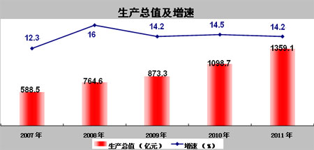 初步核算,全年生产总值1359.1亿元,比上年增长14.2%。其中,第一产业增加值252.5亿元,增长7.2%,占生产总值的比重为18.6%;第二产业增加值738.1亿元,增长19.6%,占生产总值的比重为54.3%;第三产业增加值368.5亿元,增长9.1%,占生产总值的比重为27.1%。人均生产总值27705元,约合4289美元。