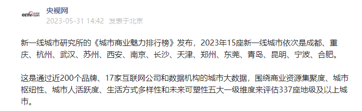据央视网今天(5月31日)发布的消息,新一线城市研究所的《城市商业魅力排行榜》发布,15座新一线城市中,苏州位列第五位。