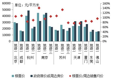 图27 部分典型地块成交楼面价与政府限价或周边楼面价对比