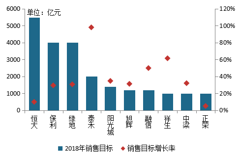 2017年,房企间“规模之战”高潮迭起。百强企业在以规模增长为导向的目标驱使下,2017年在激烈的市场角逐中全力拼搏,因城施策,积极把握市场窗口期“抢市场”,实现了销售业绩的突飞猛进,行业集中度进一步“跳涨”。2018年,尽管即将面临更加不确定的市场,面前的白热化竞争趋势却更为清晰,由百强企业目前设定的2018年销售目标来看,无不昭示了其投身未来激烈卡位战的勃勃雄心。具体来看: