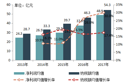 图17 百强企业2013-2017年营业收入与净利润均值变化情况
