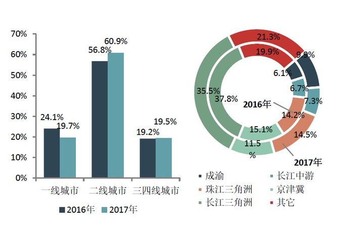 百强企业抢抓非热点二三四线城市放量契机,二线、三四线城市成交占比提升。2017年,前50企业重点项目在二线及三四线城市销售额占比达80.4%,同比提升4.4个百分点,其中二线城市占比高达60.9%,同比提升4.1个百分点;一线城市在严格的政策调控下成交规模明显缩减,销售占比同比下降4.4个百分点至19.7%。百强企业在五个主要城市群的销售占比为78.7%,其中长三角占比最高,达35.5%。
