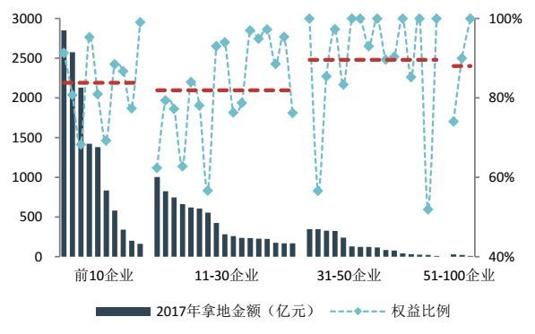 图13 2017年百强各层级代表企业招拍挂拿地金额及权益比例