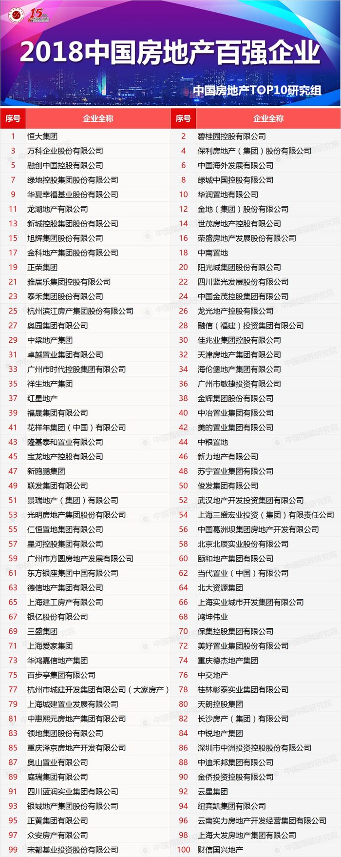 2017年,房地产市场在中国步入新时代的大背景下,将迎来高质量的发展阶段和多层次的全新发展格局,房地产企业应主动转变发展思路,适应行业发展的重大变革,挖掘新时代的发展机遇。为此,由国务院发展研究中心企业研究所、清华大学房地产研究所和中国指数研究院三家研究机构共同组成的“中国房地产TOP10研究组”以“提质稳发展,谋变新时代”为主题,发掘行业中综合实力强、成长潜力大、经营稳健、社会责任感强的优秀房地产企业群体,并研究产生了2018中国房地产综合实力百强企业。
