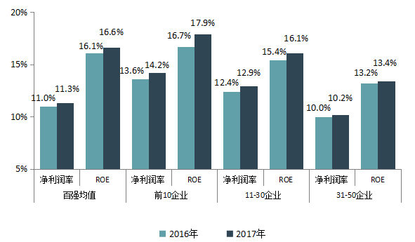 图18 百强企业不同层级2016、2017年净利润率及ROE情况