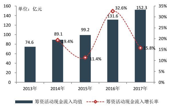 图14 百强企业2013-2017年筹资活动现金流入均值
