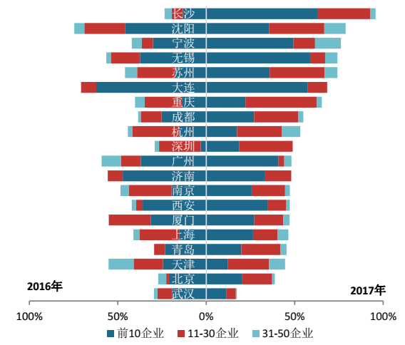 2017年,百强企业凭借自身优势持续加大热点城市深耕力度,城市拿地集中度显著提升。2017年热点城市土地市场竞争趋于白热化,其中百强前50企业在杭州、成都、重庆、沈阳、长沙等城市拿地集中度均超50%;另外,热点城市土地竞拍要求的提高导致参与门槛提升,规模较大的百强企业优势更为凸显,拿地集中度更高,如百强前30企业在重庆、成都、苏州等城市拿地集中度均超50%。