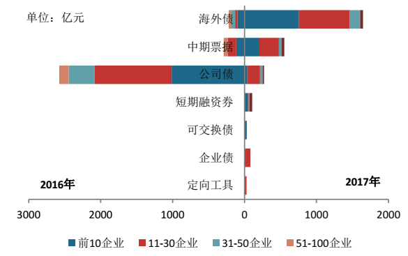 图15 百强企业不同层级2016、2017年信用债、海外债情况