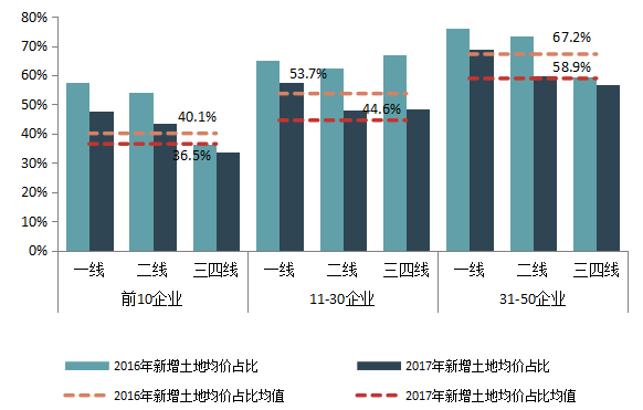 图19 百强代表企业2016、2017年新增地价占销售均价的比重