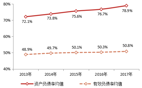 图28 百强企业2013-2017年资产负债率及有效负债率均值