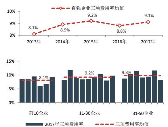 图21 百强企业不同层级2017年三项费用率情况
