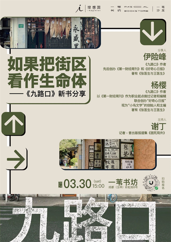 六条马路、九个路口围成一个“田字格”。在这个区域里观察一年,你会看到什么?两位作者,伊险峰和杨樱,在2021年计划以一年为限,把当时办公室所在的街市作为田野对象,做一份城市档案。3月30日下午,伊险峰和杨樱将携新书《九路口》做客一苇书坊,与读者面对面分享书里书外的故事。