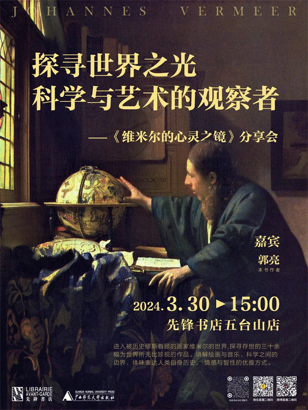 3月30日,《维米尔的心灵之镜》的作者、来自上海大学美术学院的郭亮教授将携新作来到先锋书店五台山店,与喜爱艺术的读者朋友们分享维米尔这位科学与艺术的观察者的诸多细节与故事,揭示维米尔与科学史、艺术史之间微妙的关联。