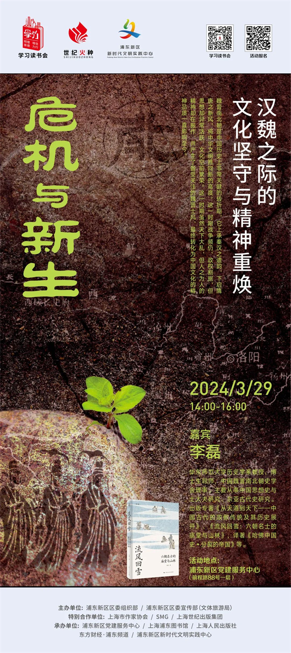 魏晋南北朝是中国历史上非常关键的转折期,它上承秦汉之遗韵,下启隋唐之新风,将中华文明推向新的高度。这一时期战争频仍、政权割据,但思想却异常活跃,文化空前繁荣。这一时期虽然天下大乱,但人之为人的精神却在振作,并产生了备受关注的魏晋士风,最终转化为中国文化的精神品质一直影响至今。3月29日,学习读书会邀请到华东师范大学历史学系李磊教授,带大家重回壮怀激荡的汉末岁月,讲述风云诡谲的曹氏政治背后诸葛亮与荀彧等名士的理想与志向,再现中华文明在离乱之际的精神重焕。
