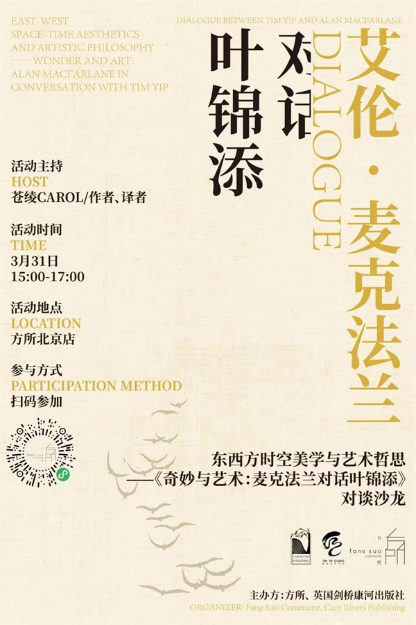 3月31日下午,麦克法兰教授和叶锦添将带着他们的对话集《奇妙与艺术》(英文原版)亲临方所北京店做新书分享。在回顾二人于剑桥多次进行“灵魂交流”的感受,以及合作完成这本对话集的心得体会之余,他们还将通过中国书法、诗歌、美术、音乐、电影等有形的艺术载体,探索东西方的美学、思想和宇宙观,并以对话的形式深入探讨由此引发的对时间和空间、物质世界和意识世界的进一步思考,以及双方对东西方文明的理解。