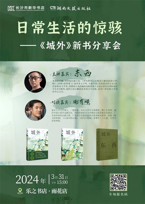 著名作家东西新出版的中篇小说集《城外》,包括《城外》《美丽金边的衣裳》等六个中篇小说。3月31日,作家东西将带着《城外》来到长沙,在乐之书店·雨花店与读者朋友见面、分享及签售!