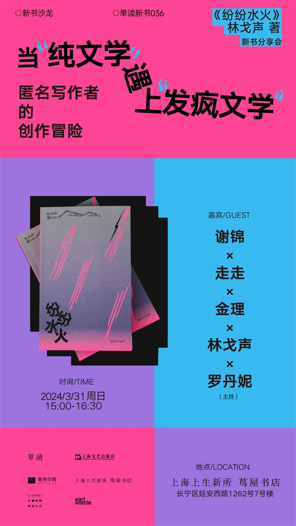 《纷纷水火》是严肃文学视野之外的“匿名”作者林戈声的首部纯文学作品。3月31日,林戈声将和《收获》副主编谢锦、作家走走、复旦大学中文系教授金理以及本书编辑罗丹妮一起来到上生新所茑屋书店,聊聊当“纯文学”遇上“发疯文学”时会碰撞出怎样的火花,那些在我们头脑中已经固化的、在生活中无处不在的界限是否在蒙蔽我们的双眼?