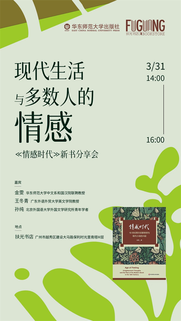 与18世纪相似,伴随现代生活而来的是扩大的同情与频发的抑郁和恐惧。深入了解18世纪,多重剖析情感,会为我们的未来提供更多可能性。情感世界是独特的,也是可译的;是不可完全言说的,也是需要永远被言说的。3月31日下午,让我们相聚扶光书店,跟随金雯、王冬青、孙纯三位学者的步伐,从《情感时代:18世纪西方启蒙思想与现代小说的兴起》出发,直抵与每个人休戚相关的现代生活和情感世界。