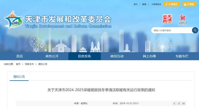 近日,天津市发改委网站发布《关于天津市2024-2025采暖期居民冬季清洁取暖有关运行政策的通知》,自2024年11月1日起至2025年10月31日止。