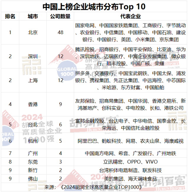 从城市来看,北京和东京并列第一,各有48家企业上榜,超过纽约,伦敦排在第四,孟买和巴黎并列第五。深圳以12家排名全球第十。整个粤港澳大湾区共31家企业上榜,占全国的23%。