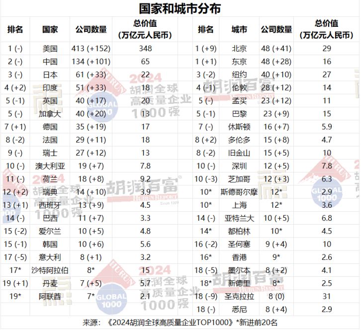 以国家来看,中国以134家位居第二,总价值65万亿元。美国以413家公司排名第一,总价值348万亿元人民币。日本以61家位居第三,总价值22万亿元。榜单显示,中国企业在榜单上的比例从7%上升到13%,主要是由于增加了国有企业。中国的134家公司中,74家是国有企业,60家是非国有企业。
